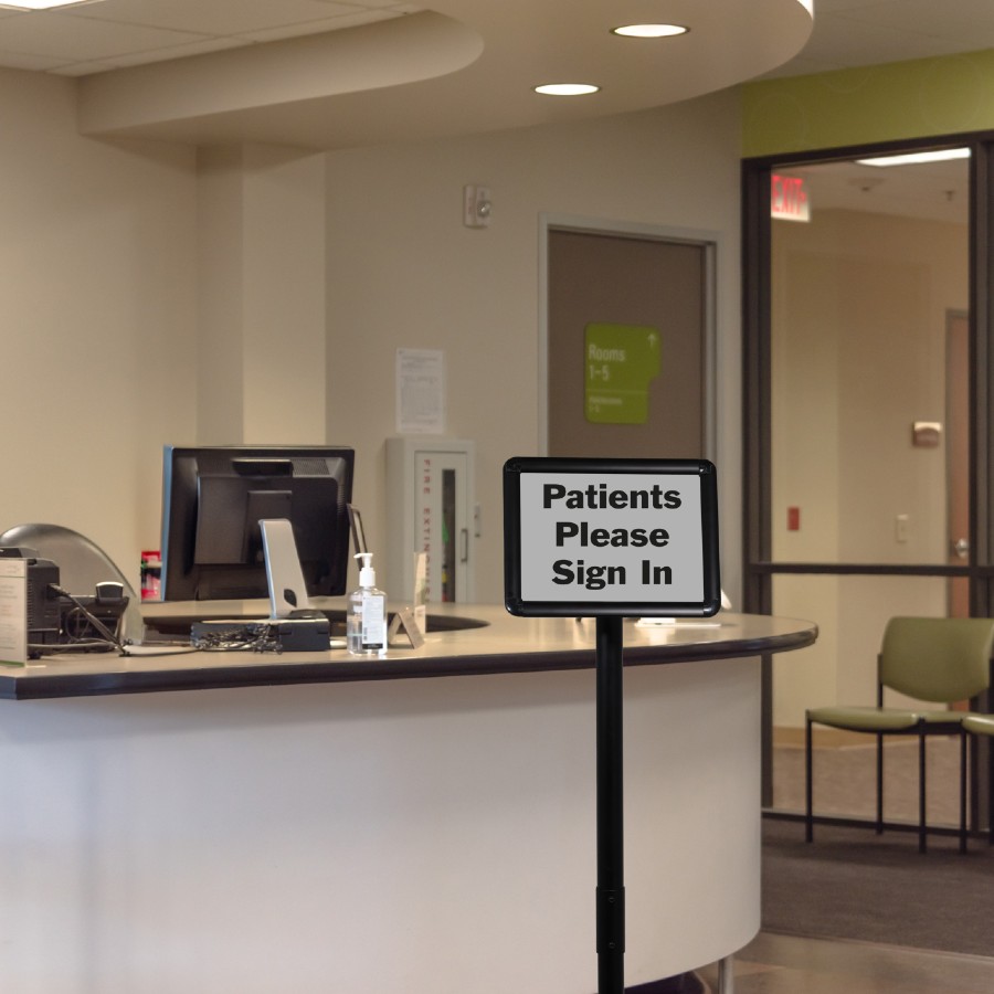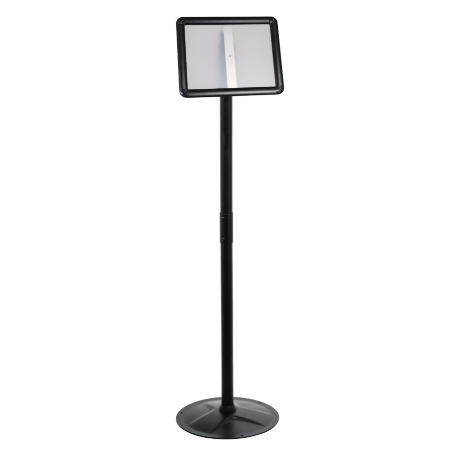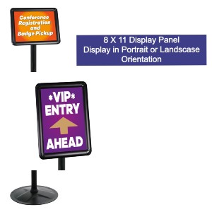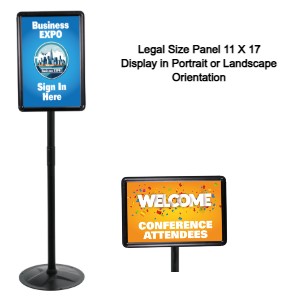 Display panel features a snap frame construction for easy swapping of material; Rotates in portrait or landscape mode; Tilts back and forth for best display angle